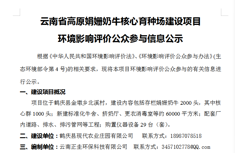 云南省高原娟姍奶牛核心育種場(chǎng)建設(shè)項(xiàng)目 環(huán)境影響評(píng)價(jià)公眾參與信息公示